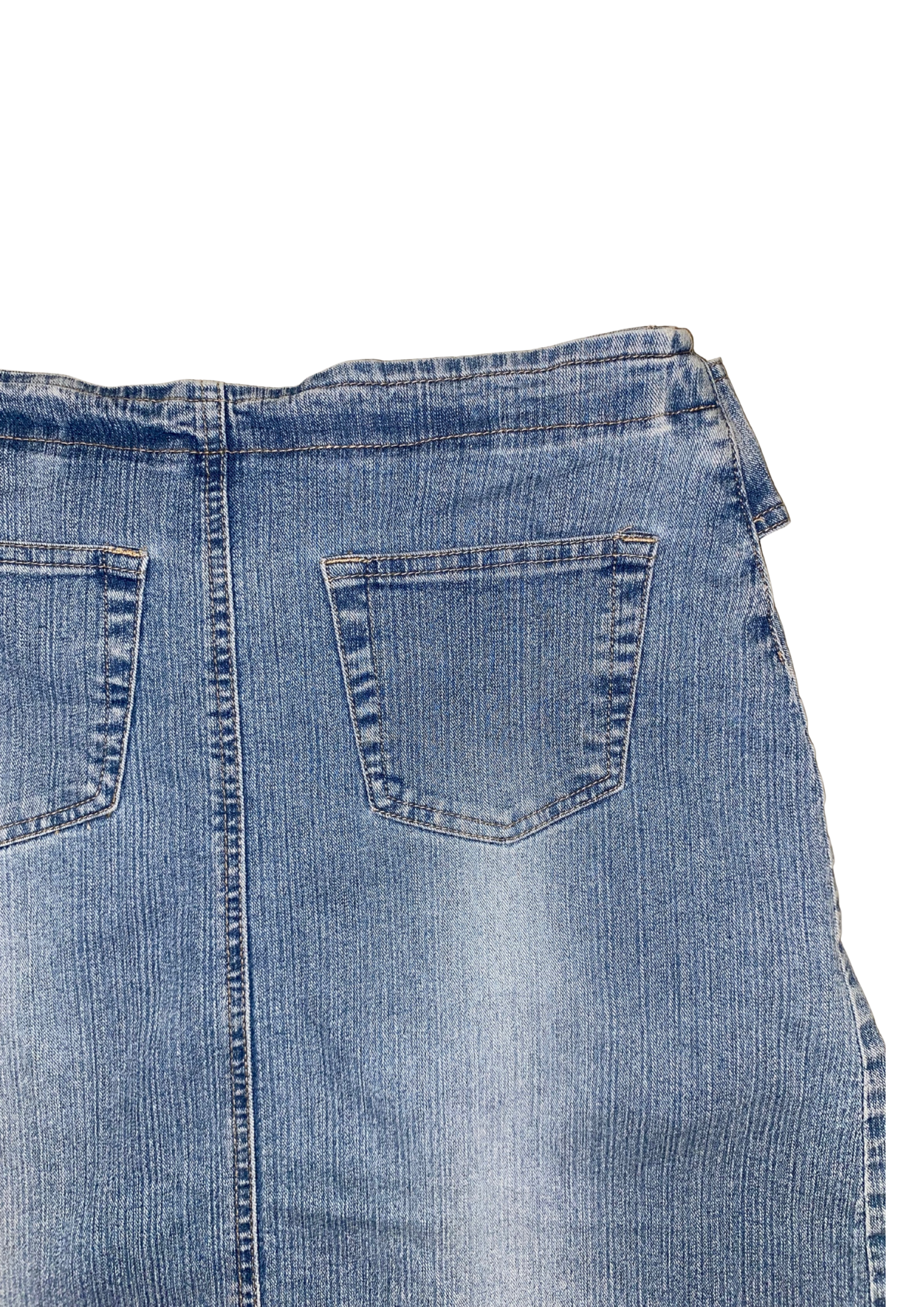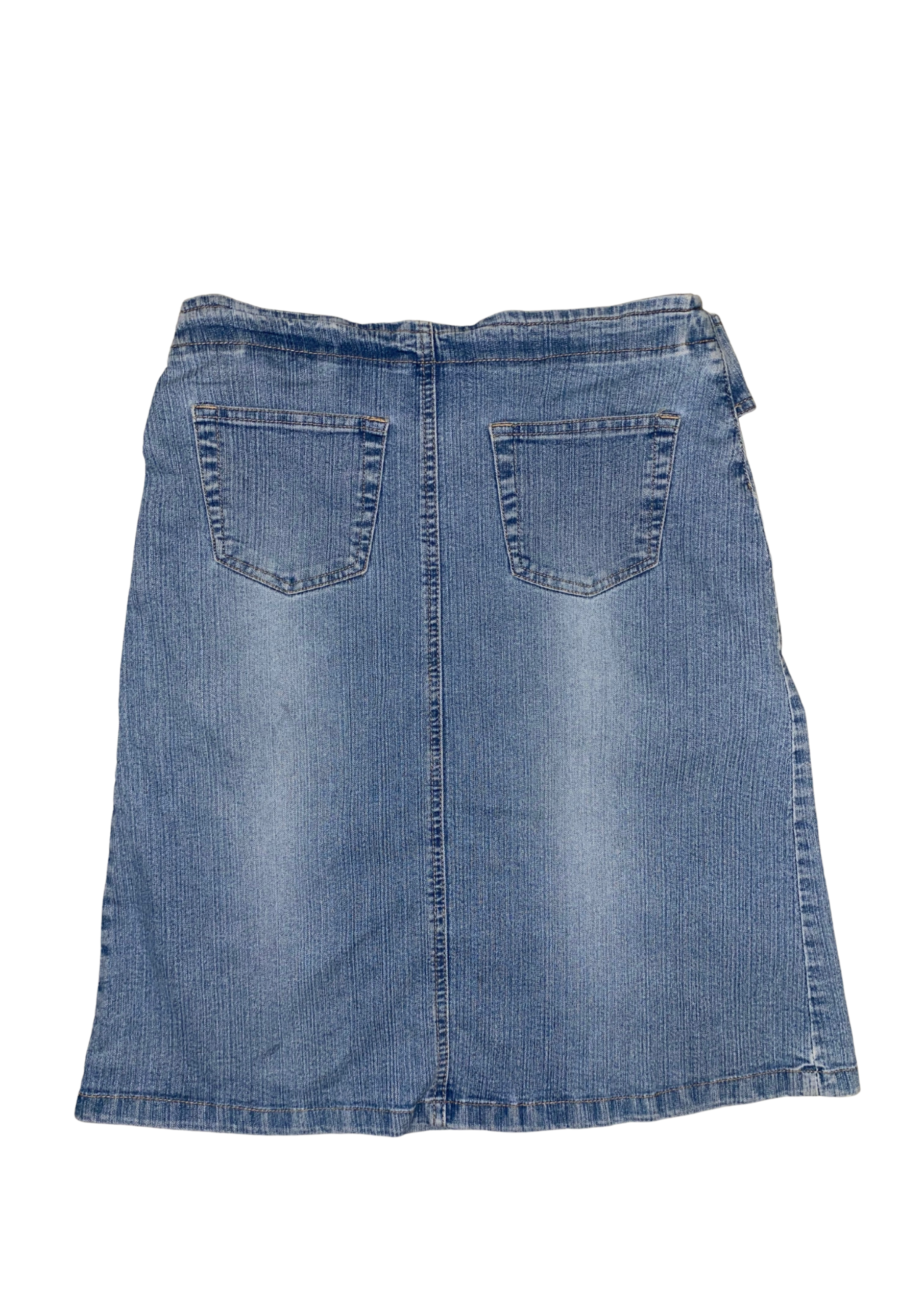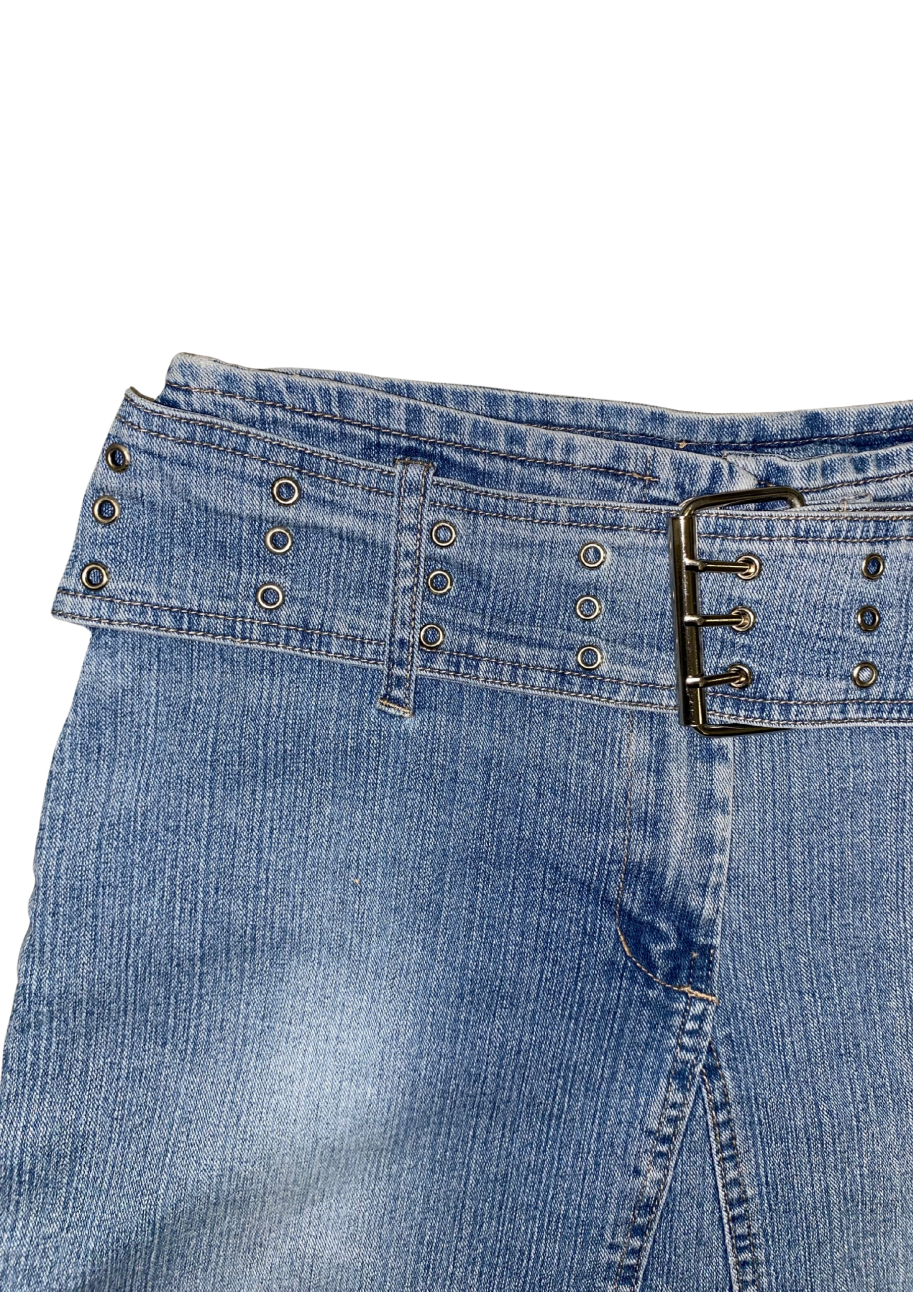 Light blue denim skirt with triple eyelet belt detail, slight stretch cotton, and two back pockets.