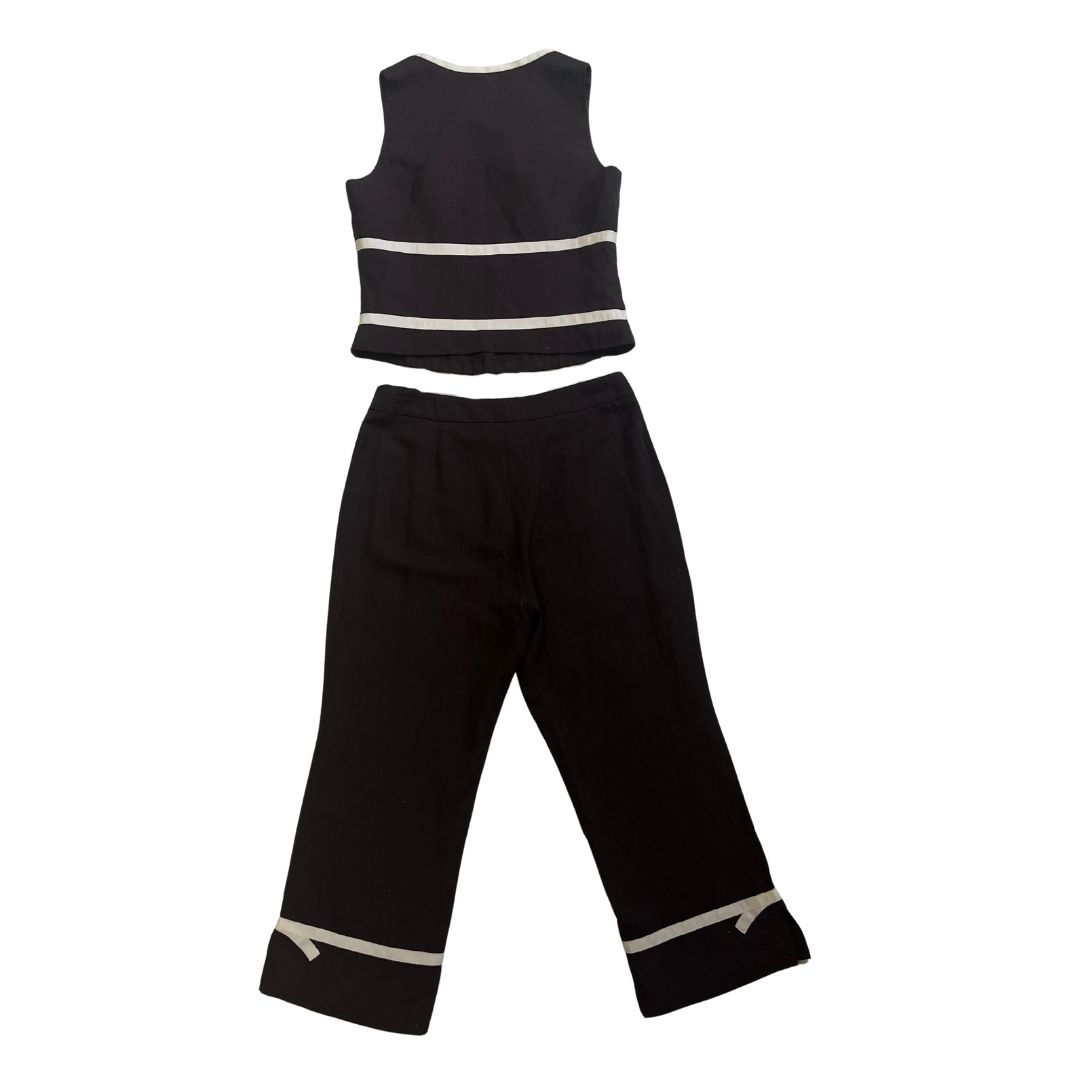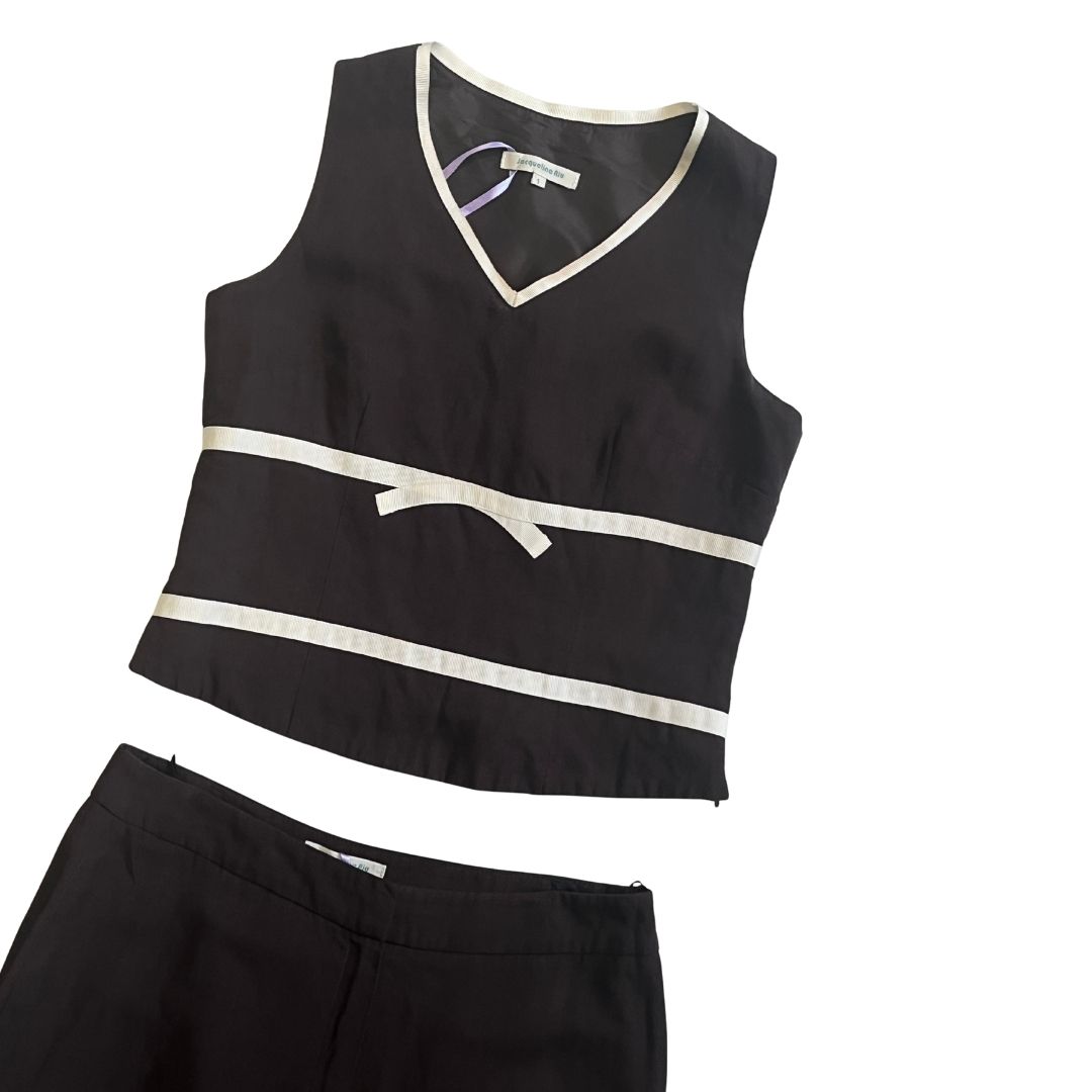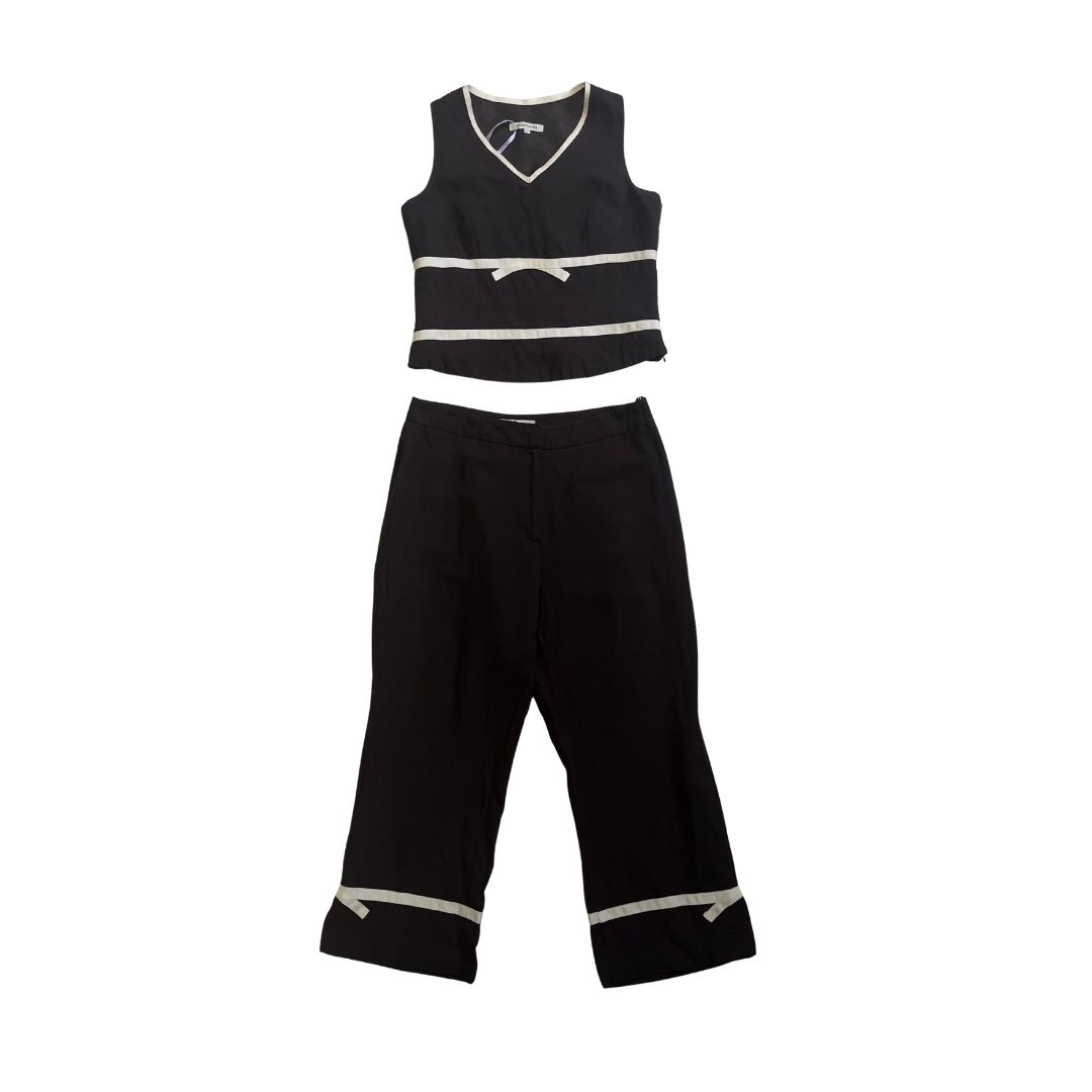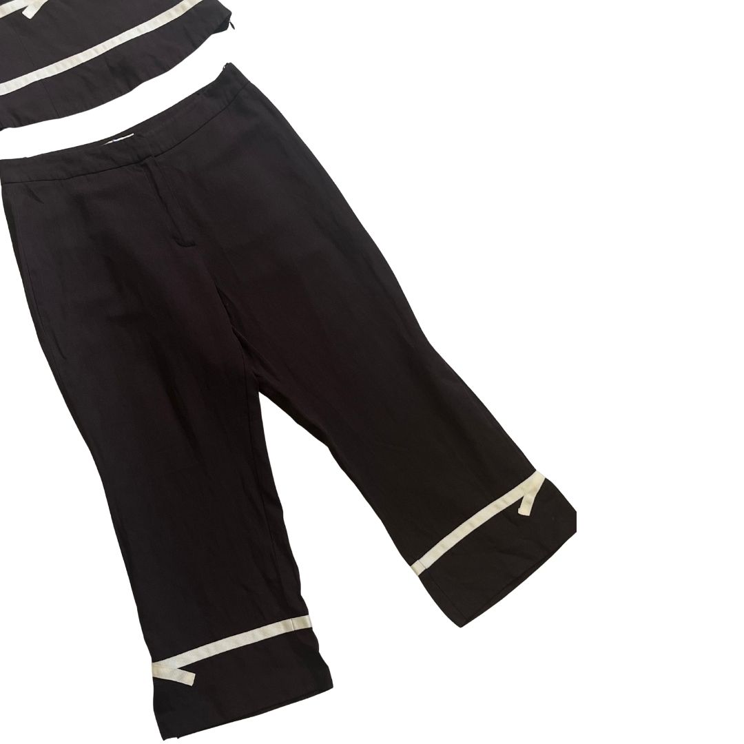 Brown set with sleeveless V-neck top and capris with off-white stripe.