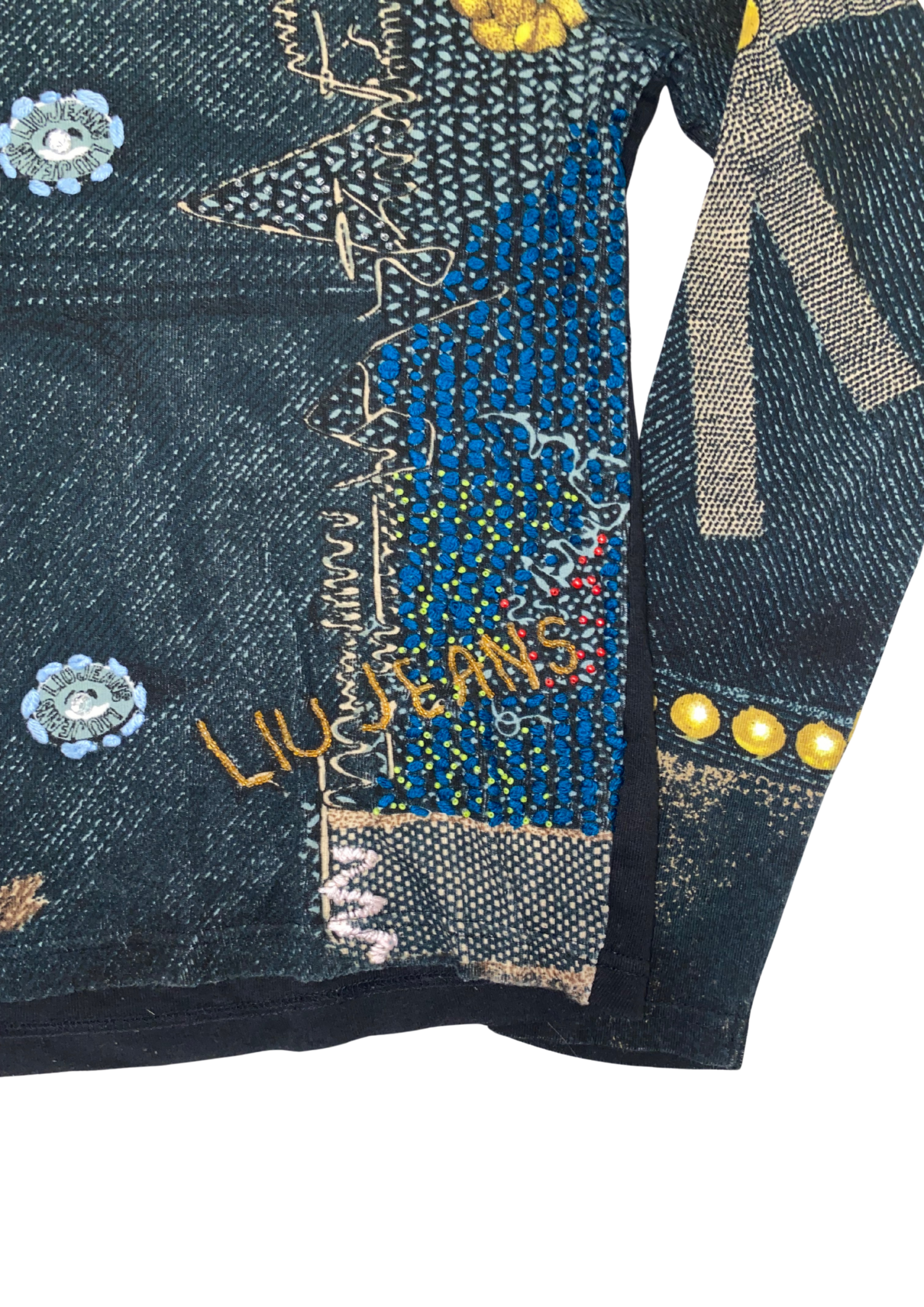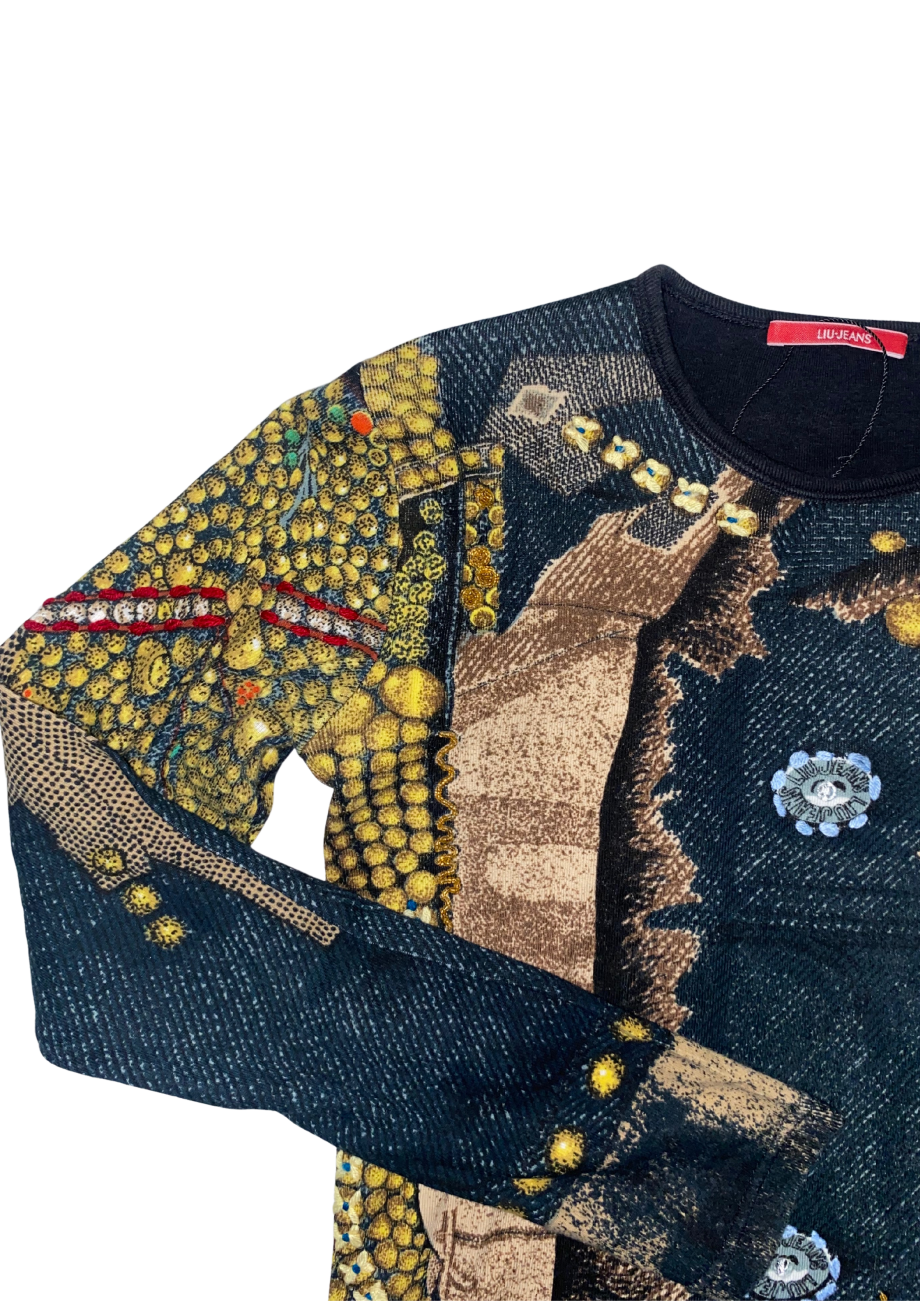 Statement graphic long sleeve from Liu Jeans detailed with textured embroidery, beading, and striking jewel tones complimented with earthy shades.