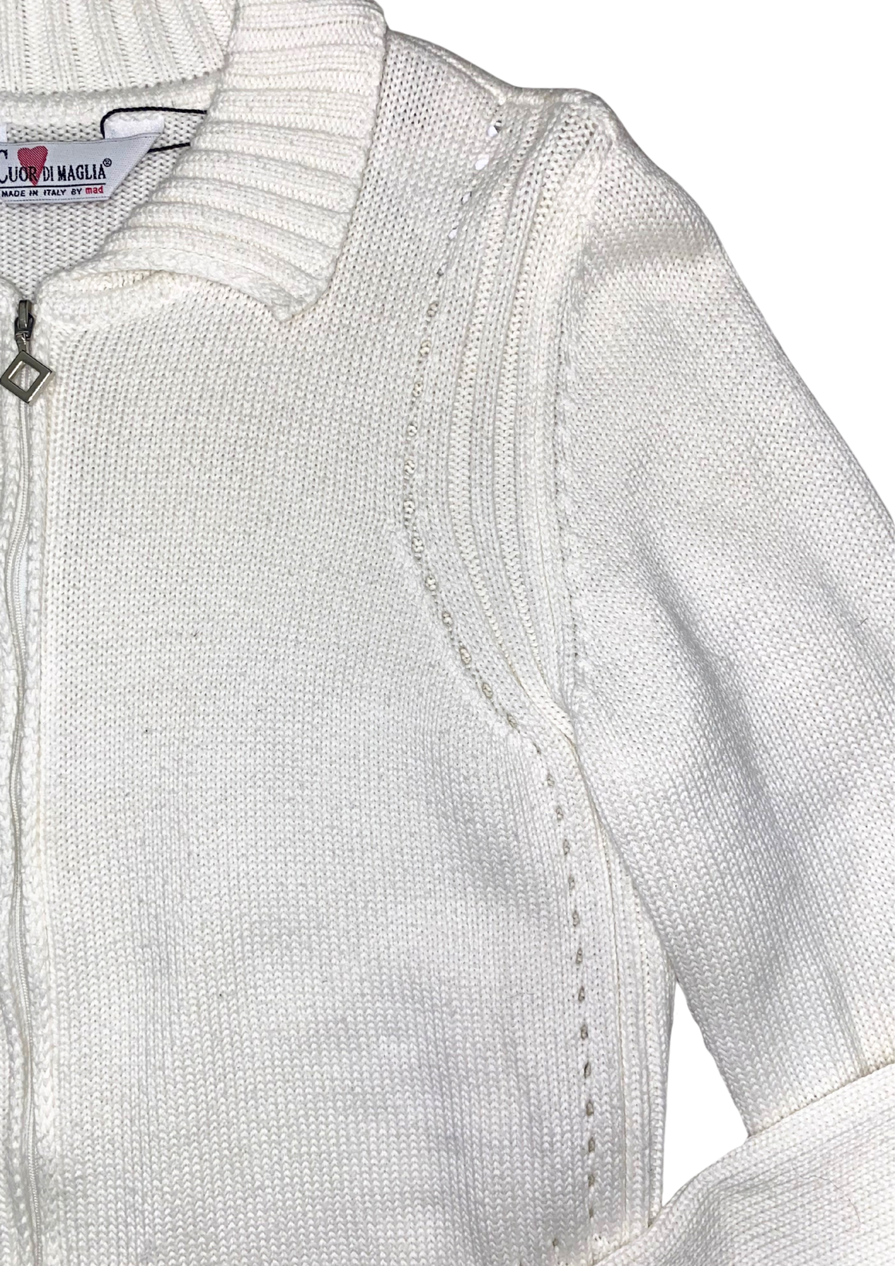 Cuor di Maglia white knit long sleeve with a versatile two-way zip, ribbed trims, and a lightweight, cotton material, made in Italy.